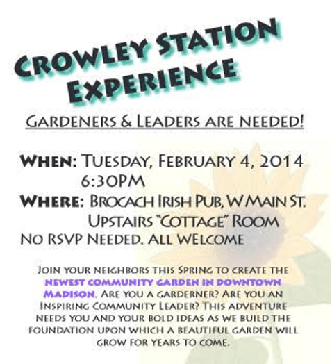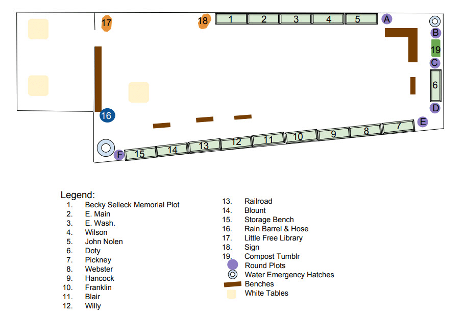 Though much was done to improve the Crowley Station, the original request to beautify the concrete decks with plants remained unfulfilled. The challenge was finding volunteers to successfully maintain potted plants on the decks. In the summer of 2012, Alder Rummel put Jim Skrentny in touch with Jane Morris of the Downtown Community Gardens Group (DCGG). The Downtown Community Gardens Group played a pivotal role in starting the garden. The DCGG was founded in 2009 by two downtowners tired of bicycling to distant community gardens and taking up plots that could have been meeting the needs of gardeners closer by. Subsequently, DCGG talked to alders, city staff, and committees; gave presentations to community groups, walked downtown neighborhoods to share ideas and scout for sites; and attended the farmers market, gathering signatures and talking garden talk.
