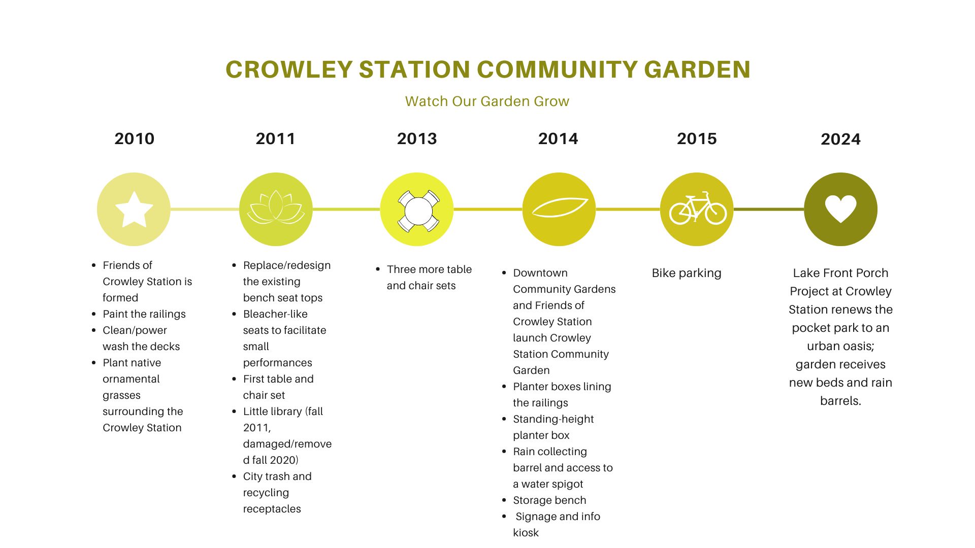 Beginning in 2024, the Crowley Station Community Garden site has been renamed the Crowley Station Community Garden at Lakefront Porch Park.